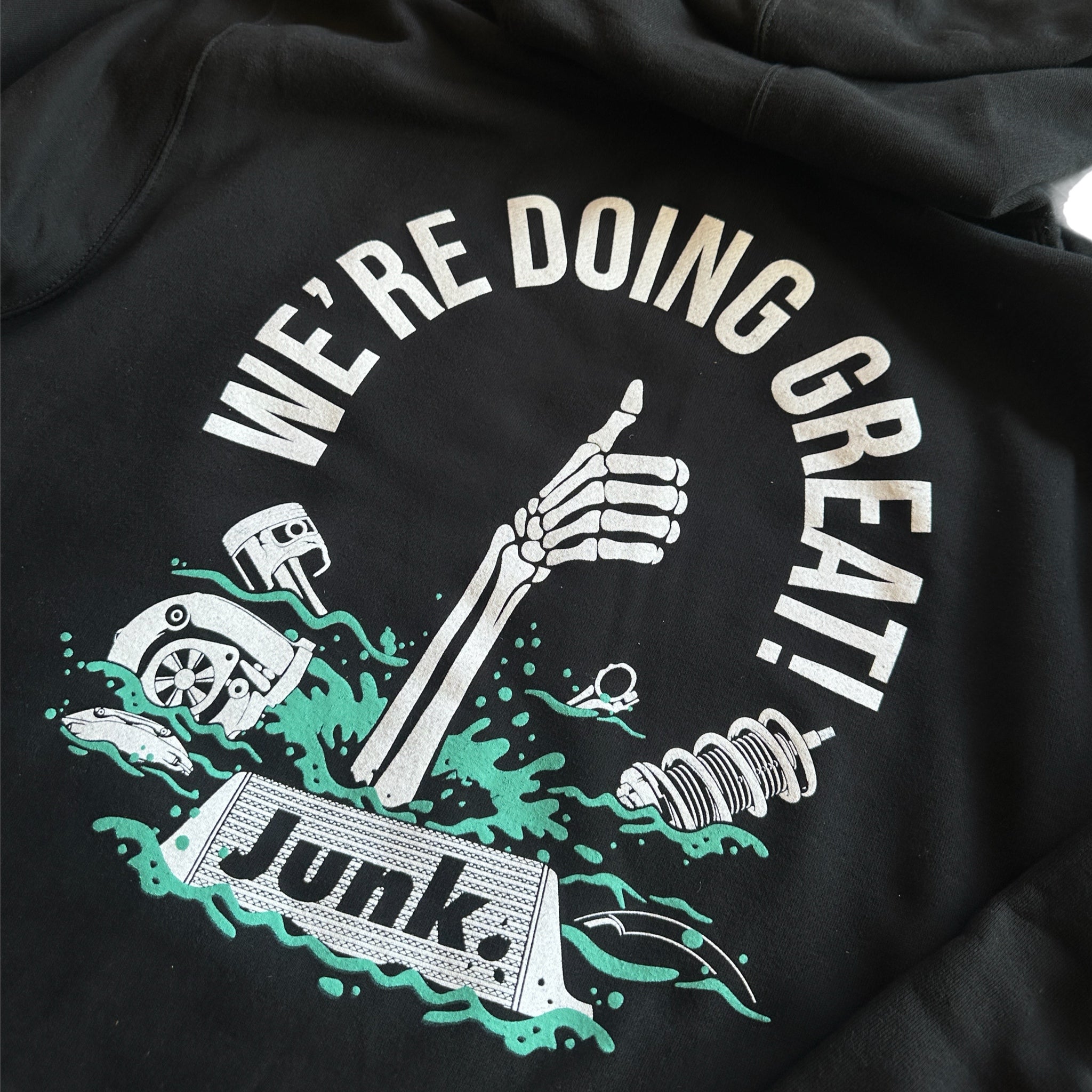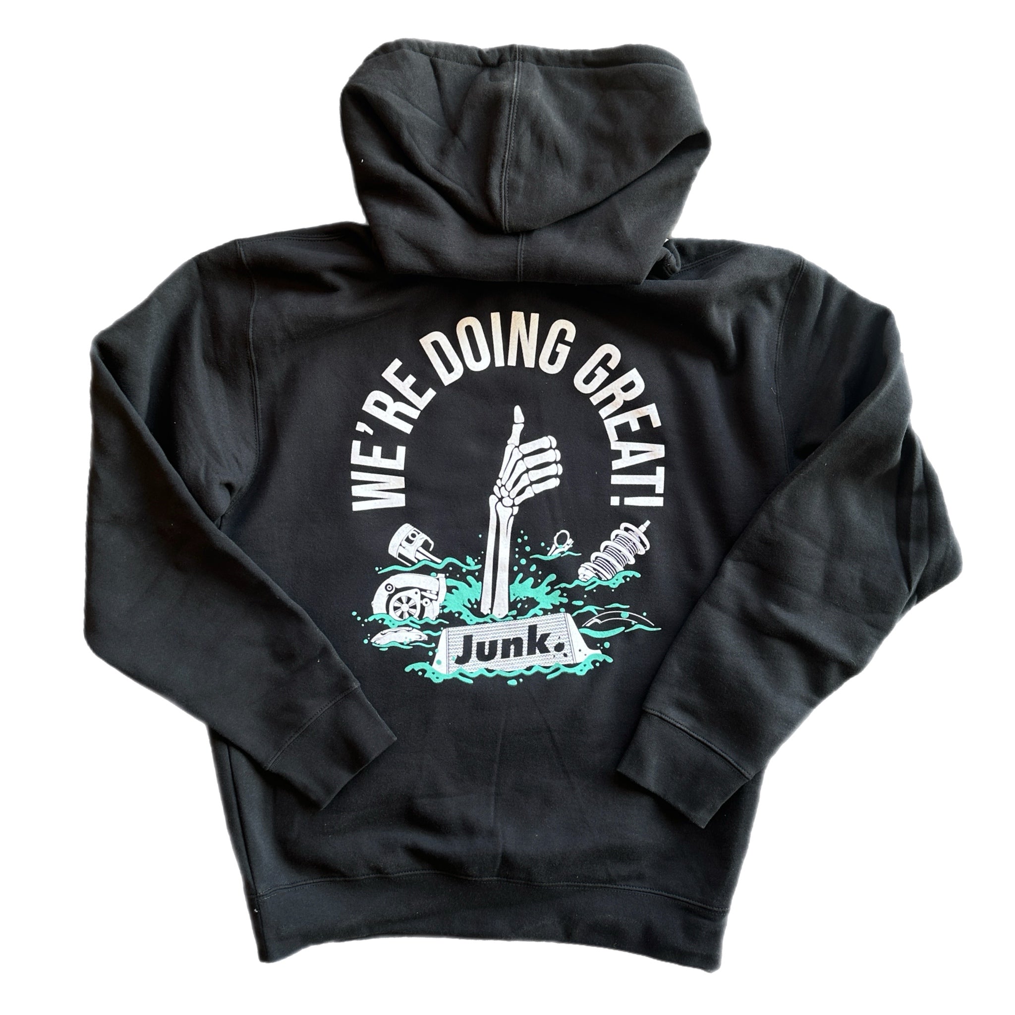 It’s a heavy, super comfy 10oz fleece with a relaxed fit — the kind of hoodie you end up wearing every day. Clean print, fleece-lined hood, double stitching everywhere, just solid quality all around.